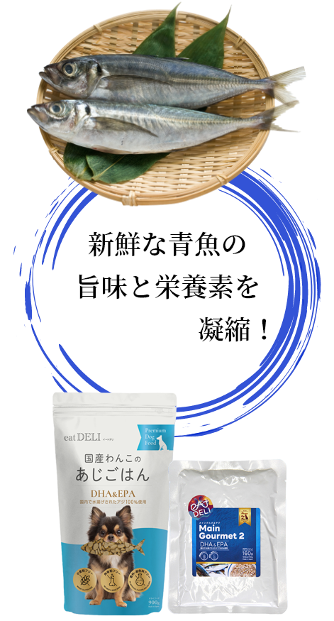 イートデリの、メインディッシュともいえる”国産わんこのあじごはん”には国内産のアジをタンパク源に使用したドッグフードです。